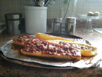 1 西葫芦切一半去籽 2 洋葱切碎放入油锅里煸炒+盐+胡椒粉冷却待用 3猪肉米里+鸡蛋+葡萄酒+盐+胡椒粉搅拌 4番茄酱+糖搅拌 5 把2和3混合搅拌放入西葫芦肚子里 6 把搅拌好的番茄酱倒入5的上面 6再撒上奶酪 7放入烘炉里250度烤30分钟即可。