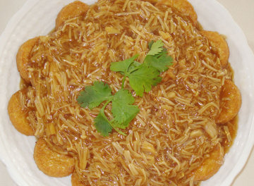 4、將日本豆腐排放好上碟,将金菇灑在日本豆腐上,再灑上蔥花或香菜即成。