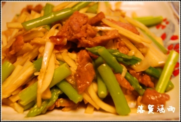 廋肉丝一些,手撕菇1根,茭白1根,芦笋1把,生抽、耗油、芥菜油各适量