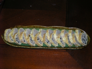 特别强调几点:第一,鸡腿要大一些,第一次做的时候鸡腿买的有点小,非常不容易把蛋黄卷住。第二,保鲜膜要用可加热的,这样才安全,而且要记得扎些小洞。第三,时间充足的话,最好要进冰箱冷藏一下,第一次做就是在室温放凉就切了吃了,切的时候就容易散。大概就是这样了,多试几次其实就很简单了,但是拿到饭桌上,就是个大菜了。
