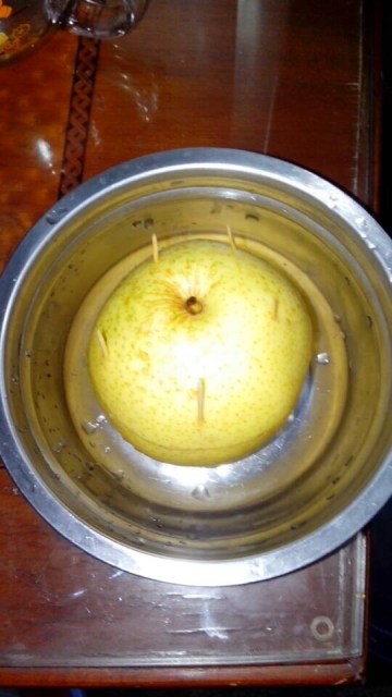 2、放几颗冰糖进去,插几根牙签,隔水蒸30分钟左右就ok了。
