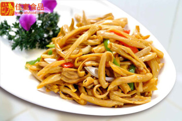 2、将脆食管改刀切细,加入老抽煸香后盛盘备用。