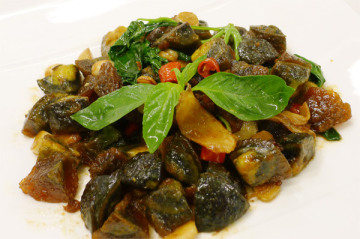 加入缸底酱油、糖、米酒后翻丑均匀。起锅前加入新鲜的九层塔叶即可。
