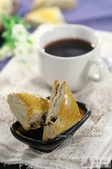 2.1、黄油切成丁软化。鸡蛋打散成蛋液。2、加入白糖拌匀。3、低粉、全麦粉、泡打粉、盐混合均匀。筛入黄油里,用手搓至黄油和面粉混合均匀。4、搓好的面粉呈较粗的颗粒状.5—6、加入2/3的蛋液和牛奶团成面团。7、倒入葡萄干。把葡萄揉进面团并均匀分布在面团里.8、把面团分成三份。用擀面杖把面团擀成长方形的面片,切成三角形。9、把切好的面片放入烤盘,刷上剩余的蛋液,放入预热的烤箱200度烤15分钟左右。
