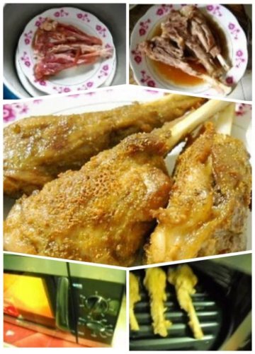 1.鸡肉用腌料腌制入味(没有就用上面ps1)的方法,2个小时就可以,过夜更好~可以用整只鸡,鸡腿,鸡翅。