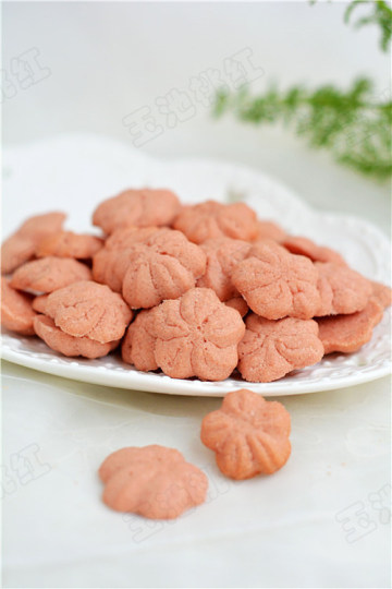 黄油65克 低面100克 糖粉30克 蛋液25克 细砂糖15克 红曲粉1克