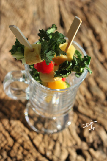 3、将卷好的香菜卷用竹签串起来,中间穿彩椒。