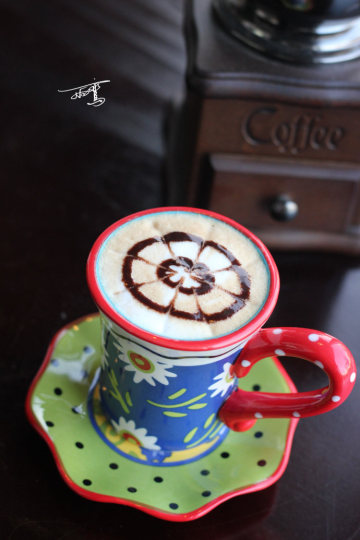 6、按照咖啡杯的大小挤两圈或者是三圈朱古力酱。