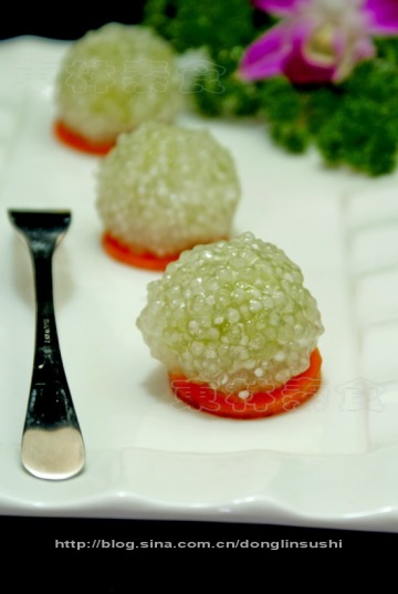 6、6个豆沙丸子分别沾上淀粉,用小西米包裹成圆子状。胡萝卜切6个圆片备用。