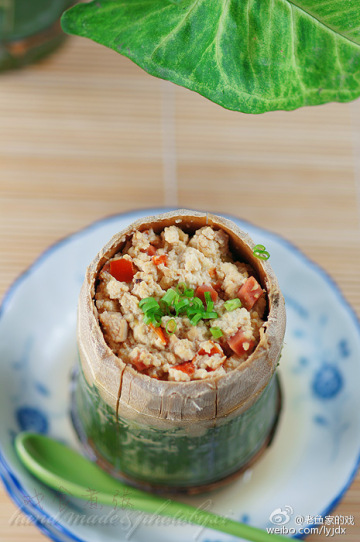 2、也可以不用经过炒制的步骤,鸡肉腌制好之后,与豆腐番茄火腿等混合,直接灌入竹筒内蒸制,更为清香。