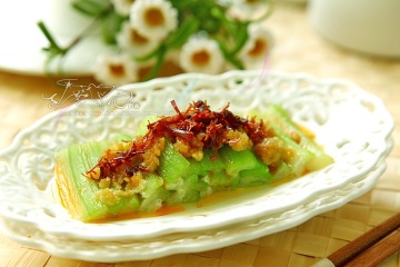 5:丝瓜条码放在盘中,将蒜蓉铺在丝瓜上,淋点生抽、辣椒油和xo酱。