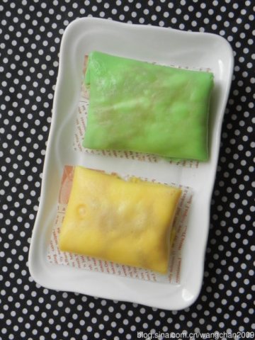 7,榴莲班戟的做法一样,只是面糊中的蛋黄换成蛋白,另外多加了几滴班兰香精,内馅的芒果换成榴莲肉。