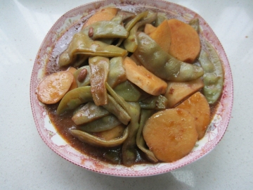 扁豆500克,芋头250克,盐酱油黄豆酱糖鸡精适量。