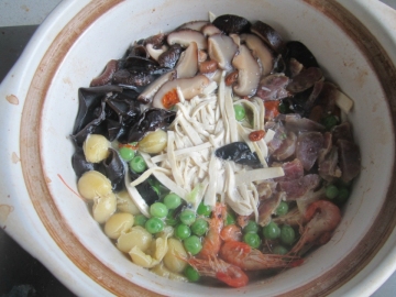 4、砂锅里放干丝,加木耳、虾、香菇丝、白果、豌豆、香肠,倒入高汤煮10分钟。