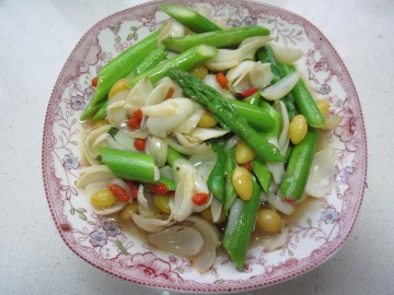 芦笋200克,鲜百合100克,枸杞20粒,白果20粒,盐、鸡精、油适量。