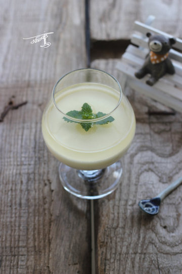 10,将一片薄荷叶插入杯中,做成盆栽的样子,然后倒入步骤9的吉利丁糖水溶液,放入冰箱冷冻室冷冻几分钟至吉利丁溶液凝固即可。