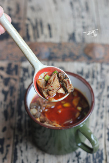 7,倒入适量高汤,加一点糖,(因为火锅底料的咸味足够,盐可以不加,如果觉得不够味,加一点点盐调味)大火烧开,小火炖至羊杂软烂即可