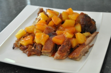 5,然后菠萝和汤汁一并浇到码好的烤鸭上