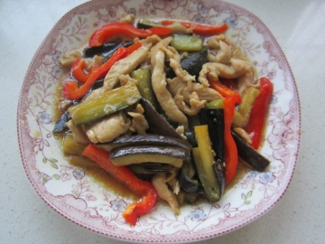 榨菜头半个,中国茄子一根,鸡肉半磅,bell pepper一个,葱一根,姜末一撮