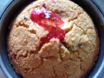 5 将红玉金糕放进烤箱,375度,烤约15分钟,用筷子插进玉米蛋糕是干燥的,就好了,烤时蛋糕有一些蓬松,草莓酱自动流出少许,像红玉一样,美观又健康。enjoy.