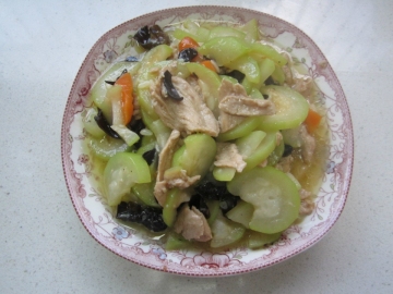 瓠子200克,鸡肉100克,胡萝卜1根,木耳少许,油、盐、葱姜、鸡精适量。