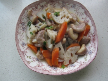 菱角200克,藕200克,胡萝卜1根,木耳少许,油、盐、鸡精适量。