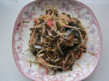 心里美萝卜1个,海带100克,盐、糖、醋适量。
