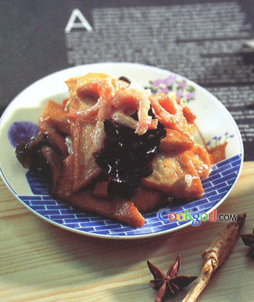 2、原锅留少许底油,放入海米煸炒片刻,用葱、姜爆香,烹绍酒,加入酱油、白糖、精盐,添适量汤,再下入炸好的豆腐片、木耳,烧至入味,加味精,找好口,用水淀粉勾芡,淋明油,出锅装盘即可。
