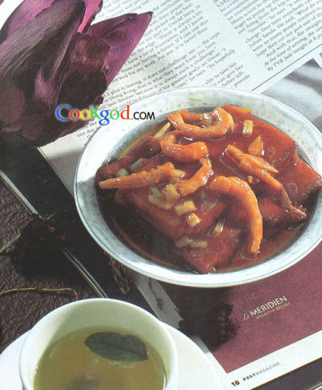 2、锅内放入底油烧热,放入葱、姜、蒜、虾仁爆香,烹绍酒,加入花椒水,酱油、白糖,添汤烧开,再加入精盐,味精找好口,转小火慢烧至入味,用水淀粉勾芡,淋明油,出锅装盘即可。
