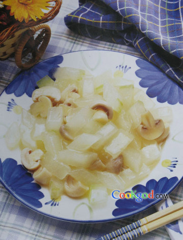 主料:冬瓜500克,蘑菇(鲜蘑)100克,调料:蚕豆淀粉5克,料酒5克,味精2克,盐3克,大豆油15克