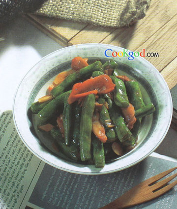 豆角300克,素菇150克。调料油500克(约耗50克),绍酒、酱油各1大匙,香油1小勺,精盐、味精各1/3小勺,葱、姜,蒜末各少许,淀粉适量。