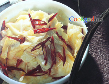 1、甘蓝除去外面老叶,洗净,切成块备用;红干椒丝用冷水泡软,捞出待用。