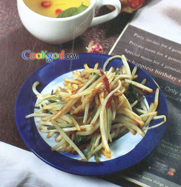 2、炒锅上火烧热,加少许底油,下入花椒粒炸出香味,捞出不要,放葱丝炝锅,烹醋,下入绿豆芽、干红辣椒丝煸炒片刻,加精盐、酱油、味精翻炒均匀,淋香油,撒香菜段,出锅装盘即可。