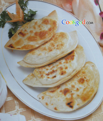 3、取平底锅放火上烧热,将合饼放入锅内,用小火烙熟即成。