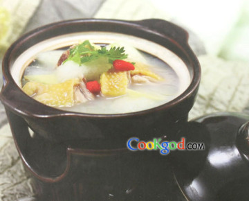 2、净锅上火,放入奶汤、姜片、三黄鸡,大火烧开转小火炖30分钟再放入冬瓜炖10分钟调味,撒上香菜段即成。