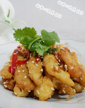 5)裹好粉的原料应立即油炸,否则会影响鳞片的生成。油炸温度控制在165度以内,炸5-6分钟,炸至色泽淡金黄捞起。用牙签刺最厚处看是否有血水冒出。