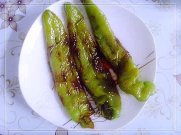 2:锅内热油,放入尖椒煎至两面皮起皱