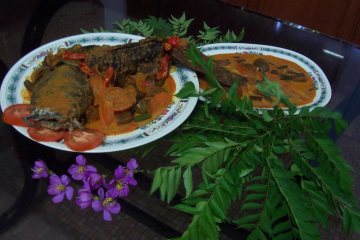透抽50公克,鲭鱼块3块,草虾3尾,蕃茄1个,洋葱1/4个,蒜末20公克,红葱头末20公克,香茅2根,罗望子膏20公克,椰奶50㏄,沙拉油2大匙,水300㏄,香米白饭1碗,南洋海鲜咖哩粉2大匙,盐1茶匙,细砂糖1茶匙