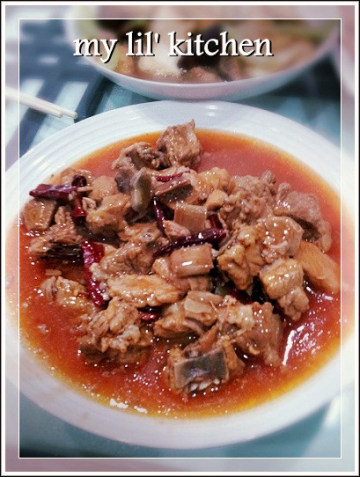 1. 排骨洗净切块,拌入二大匙corn flour,用手拌匀。辣椒干浸软剪一寸长备用。