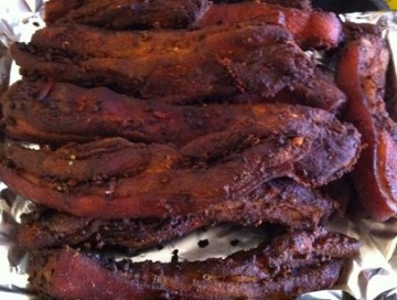 3。三天后,把烤箱开到170(华氏)腊肉放在架子上烤干,下面放个盘子接油滴(大约8-20小时可烘干)