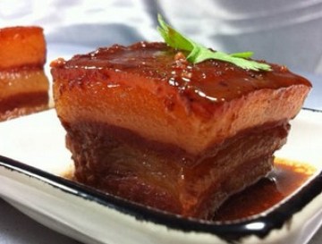 肉先煮一下,然后整形切块。锅里放葱,姜,八角,桂皮,把肉放葱姜上面。皮朝上。用酒,水或汤汁兑腐乳汁,按自己喜好调味,倒进锅里。然后就325 f 烤到酥,差不多要2到3小时。