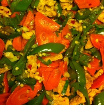 3。起油锅,大火快炒配菜,再加上红辣椒和辣的青椒,断生后把炒好的肉丝倒入。