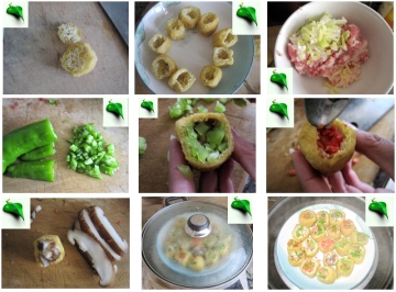 5.将以上蔬菜粒分别塞入有肉馅的豆泡;