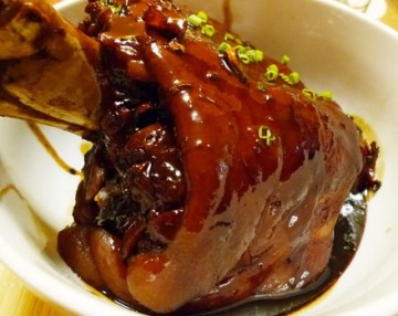 6.取约200㏄作法4的汤汁煮沸,以太白粉水勾芡,洒上香油后淋至蹄膀上即可。
