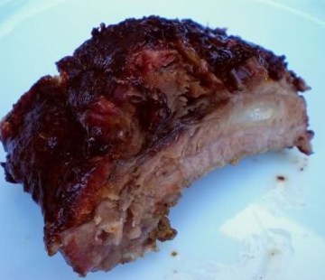 猪排, 肉面朝上, 放bbq炉的烤架上, 下面垫锡纸, 开火炉,保持温度250f, 烤3小时, 在肉面再用刷子刷上一层”抹酱”, 再烤30分钟, 好了.