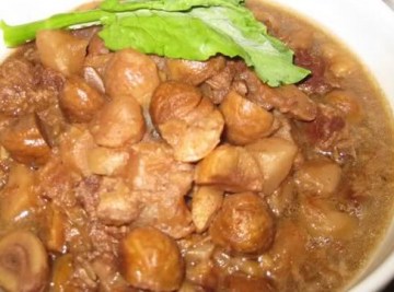 2、把栗子、土豆和红烧肉全倒进锅里,放点盐、糖,烧到栗子、土豆烂熟即可装碗。