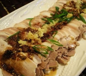 2、取出,切薄片,加麻辣酱、蒜泥、葱花在上面即可。