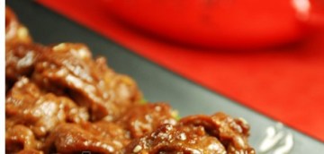 5)锅里放少油,倒入1勺耗油和2勺料酒,火略开大使汁料加热翻滚后倒入炸好的牛肉串快速翻炒使酱汁均匀裹在肉串上,撒上芝麻,并摆放在蒜薹上。
