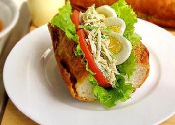 5.香芹放入沸水中焯烫一下,放入盛鸡肉丝的大碗中,加多一点沙拉酱、一点点盐和白胡椒粉拌匀。法式面包切成12厘米左右的长段,再从中间切一刀,不必完全切断,开口内抹上一层黄油,将西红柿片、生菜叶、拌好的鸡肉丝、鸡蛋片一起夹在面包内就好了。