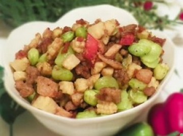 五、倒入利马豆、玉米芯和萝卜干,点入精盐和糖,稍翻炒;